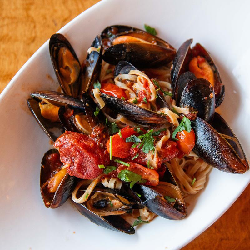 Linguine, mussels, roasted tomatoes, white wine, Calabria peppers, and parsley.
