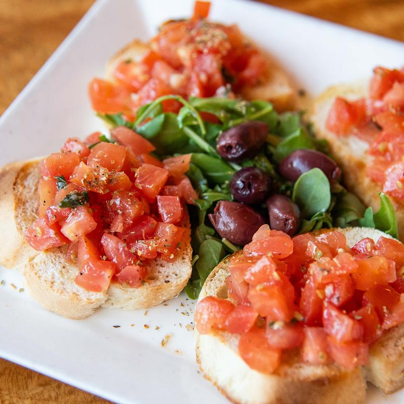 Crostini, tomatoes, garlic, oregano, basil, and EVOO.
